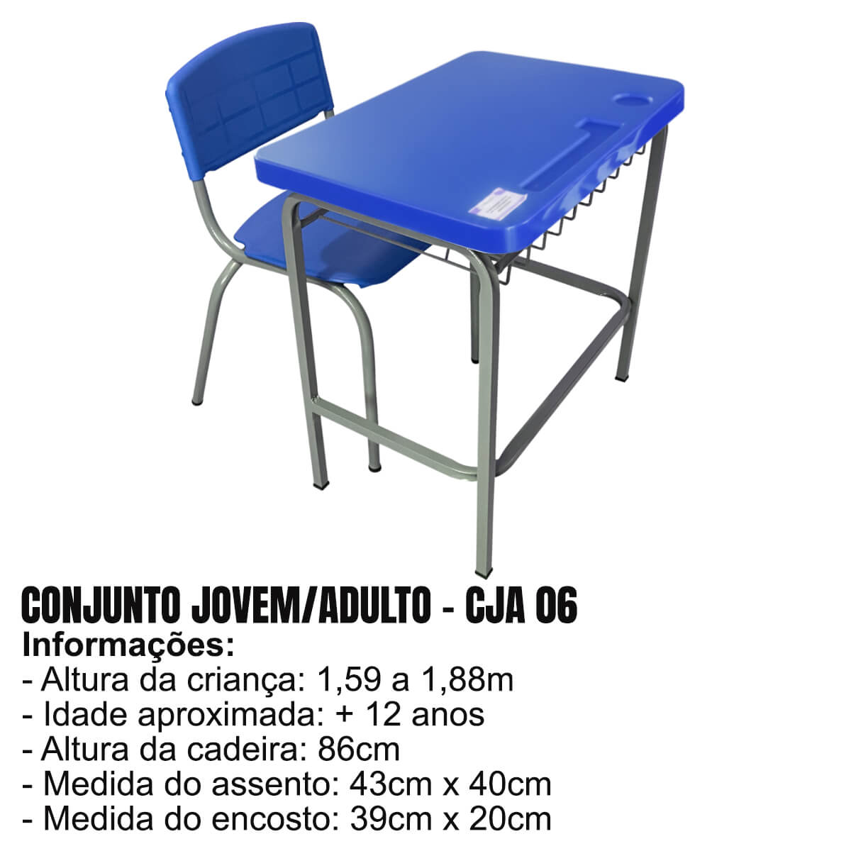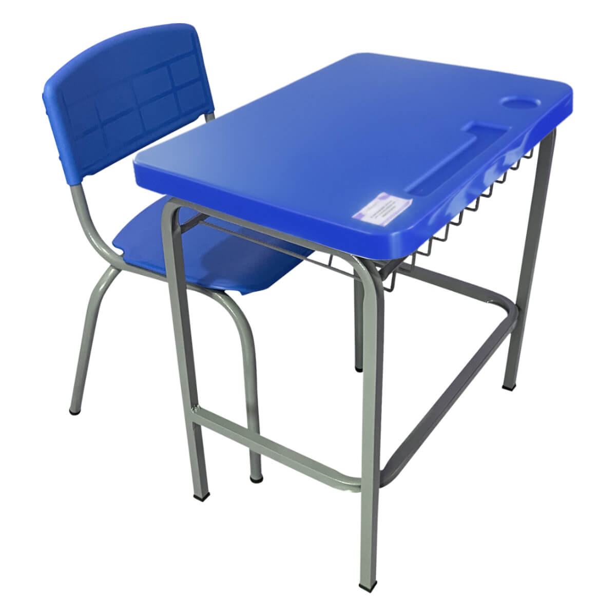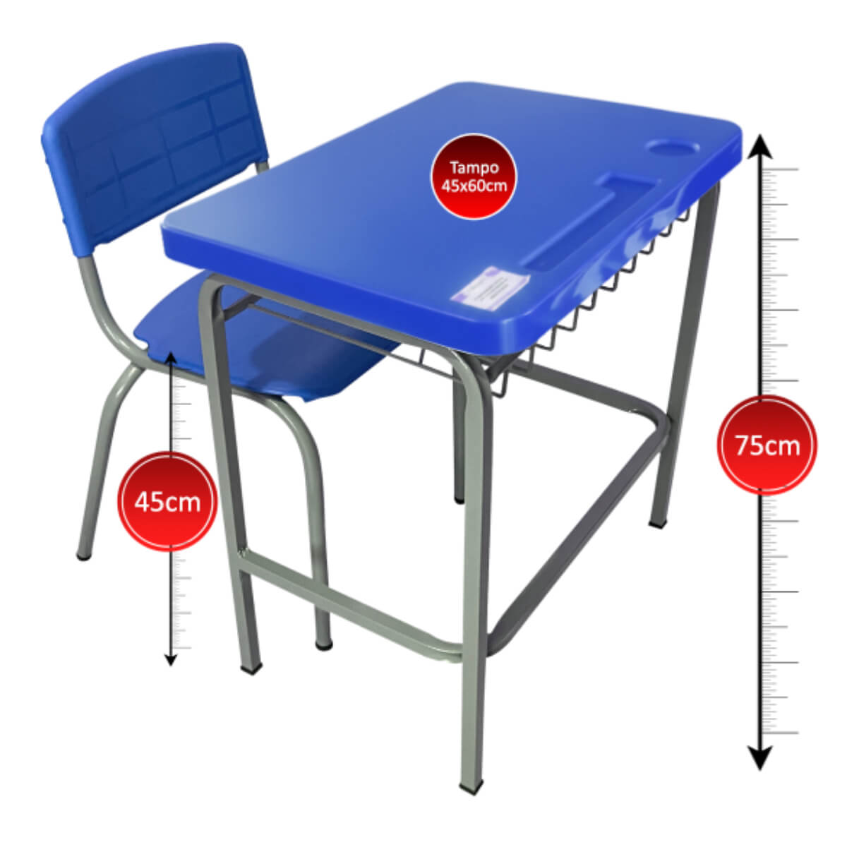 Conjunto escolar infantil padrão FNDE CJA05 com porta copo e porta lápis no plásticos na cor azul.