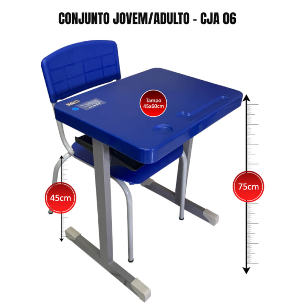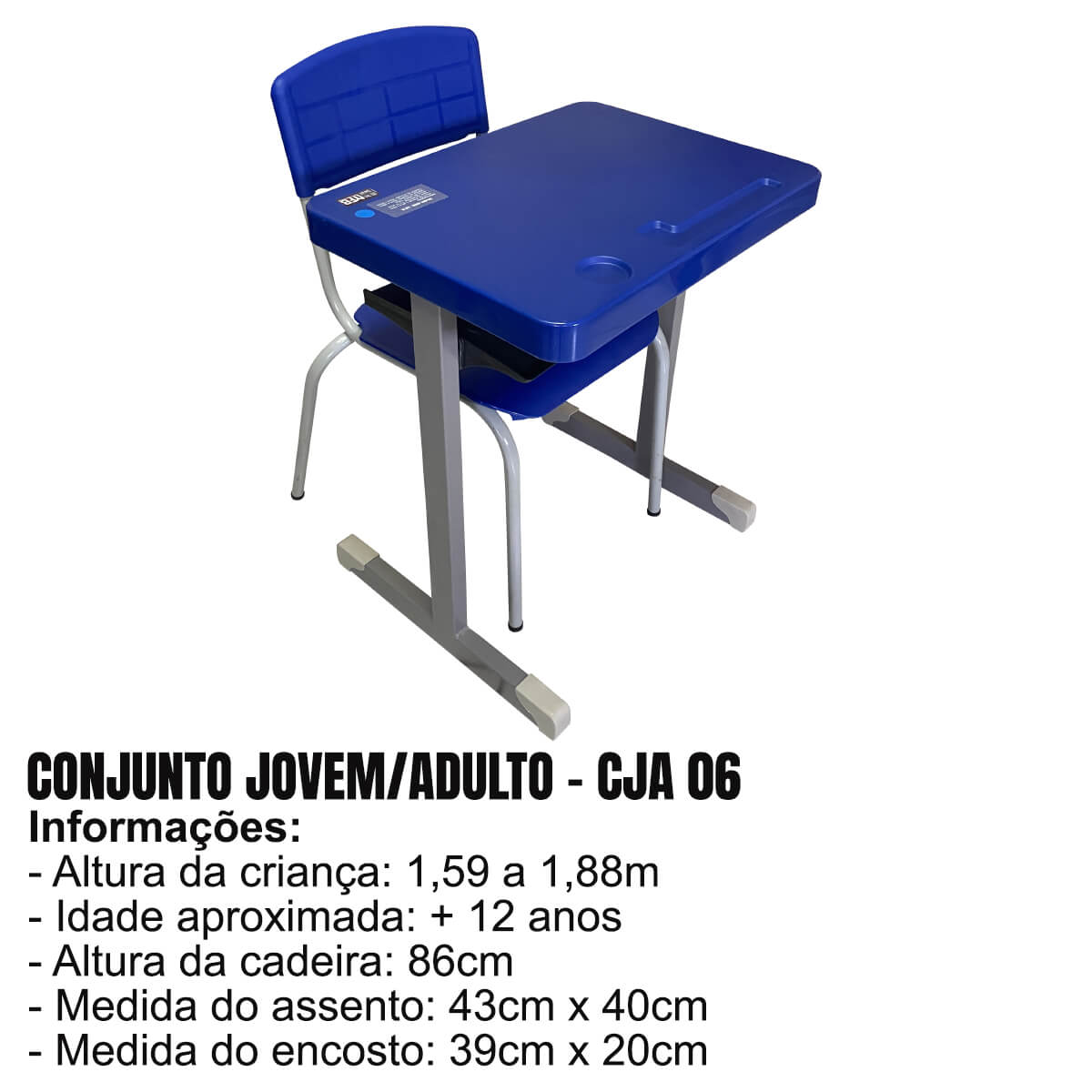 Conjunto escolar infantil padrão FNDE CJA06 com porta copo e porta lápis no plástico na cor azul.